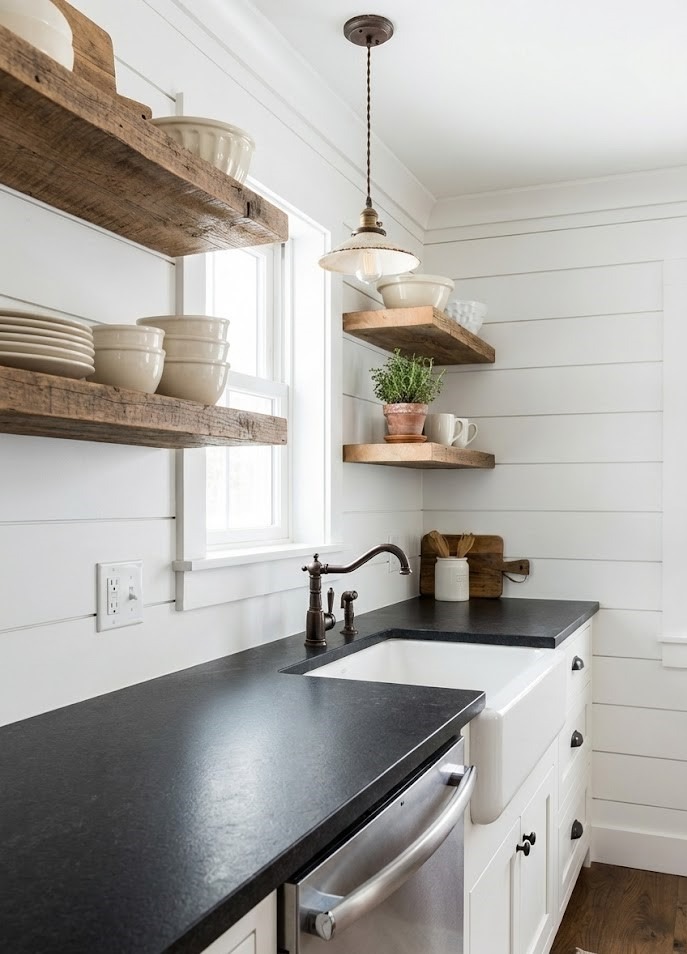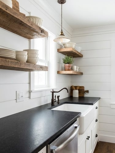 You can elevate the cozy farmhouse look by swapping traditional white marble for honed soapstone or charcoal-black quartz. Paired with a classic apron-front sink and white shiplap walls, the black countertops add a layer of unexpected sophistication to the "lived-in" farmhouse aesthetic.