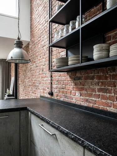 In industrial-style kitchens, leathered black granite provides the perfect textural counterpart to exposed brick and concrete. The slightly pebbled, non-reflective finish of leathered stone feels raw and urban, unifying different materials like stainless steel and black metal shelving into a cohesive design.