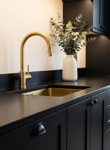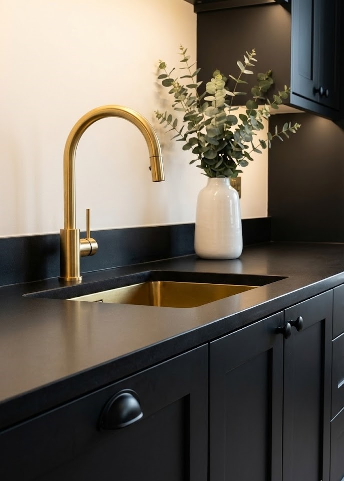 There is perhaps no more elegant pairing than black countertops and gold or brass hardware. The warmth of the metal against the cool black surface creates an "expensive" look that feels both classic and contemporary. This works best when balanced—consider a gold faucet paired with matte black cabinet pulls.