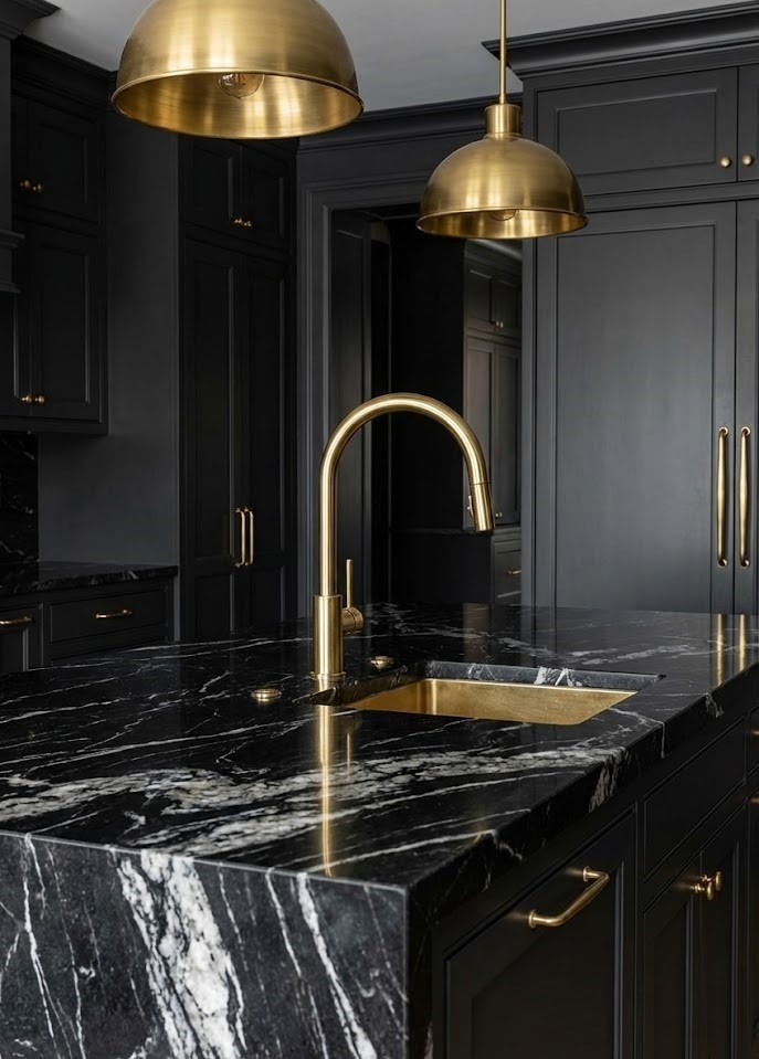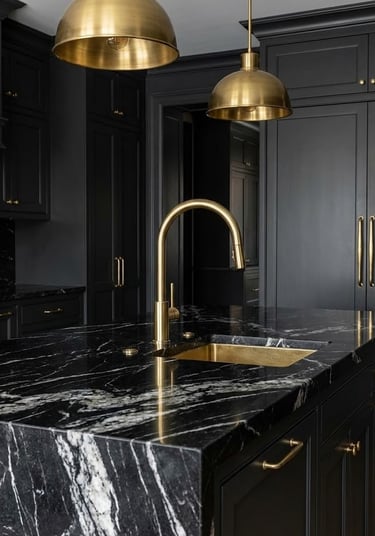 For ultimate opulence, Nero Marquina or Belgian Black marble is unparalleled. The natural white or gray veining against a deep black background turns the countertop into a piece of functional art. To lean into the luxury, pair these marble surfaces with brass or gold fixtures.