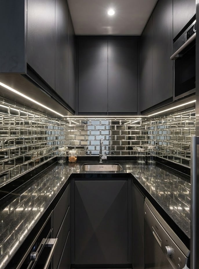 In very tight kitchens, a high-gloss black finish can actually help reflect light, especially when paired with a mirrored or metallic backsplash. This strategy doubles the visual space while providing a sleek, modern edge to a small galley or studio kitchen.