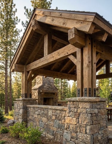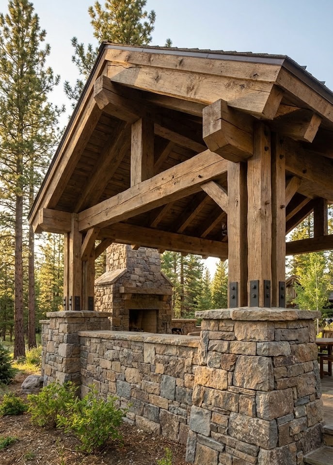 For a cottage or mountain-inspired look, combine heavy oak beams with stone column bases. It gives the structure a sense of permanence and "old-world" charm.