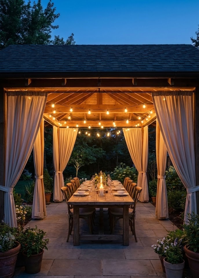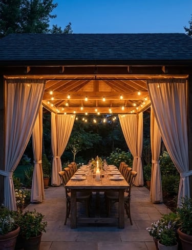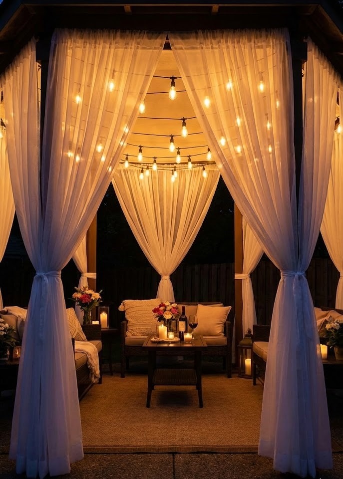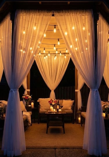 Focus on the finishing touches to create an inviting atmosphere. Use flowing polyester curtains and warm Edison-style LED bulbs to turn a simple structure into a romantic retreat.