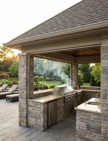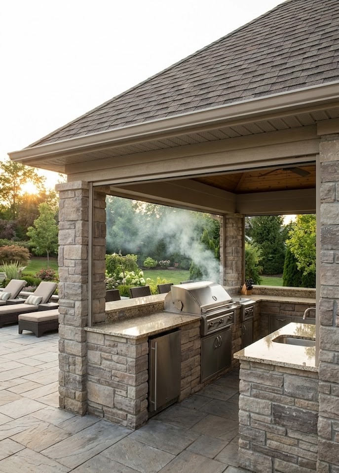 Transform your yard into a culinary destination. By housing your grill, stone counters, and a small refrigerator under a permanent roof, you can cook in any weather.
