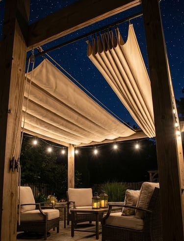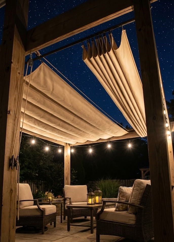 If you enjoy stargazing, a retractable canvas roof offers the best of both worlds. Use a pulley system with waterproof, fade-resistant fabric to adjust the shade throughout the day.