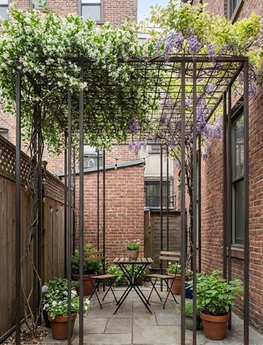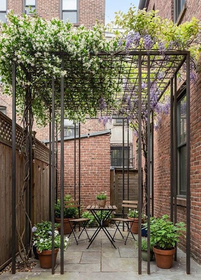 Even a small 2.5x3 m city courtyard can benefit from a pavilion. Using thin metal posts and a roof grid covered in jasmine or wisteria creates a lush, fragrant canopy that saves on ground space.