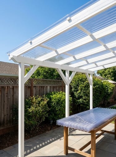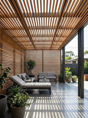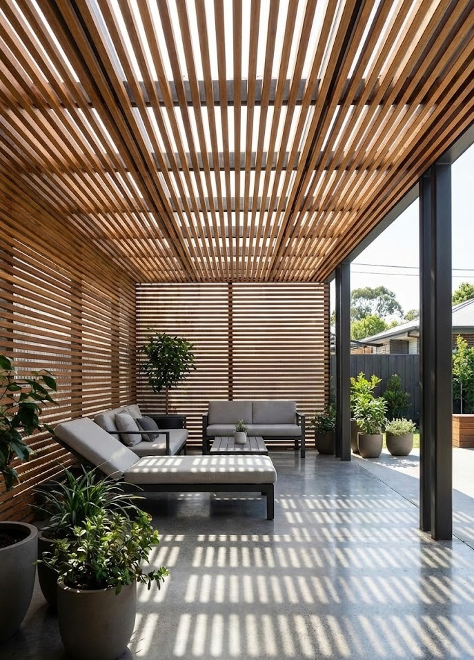 Waterproofing Hack: Back the slats with clear polycarbonate sheets to keep the space dry without losing the modern, open-air look.
