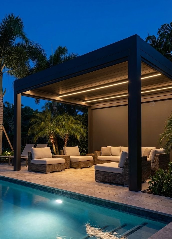 A poolside pavilion serves as a private resort cabana. Focus on moisture-resistant materials like aluminum frames and woven resin furniture that can withstand splashes and humidity.