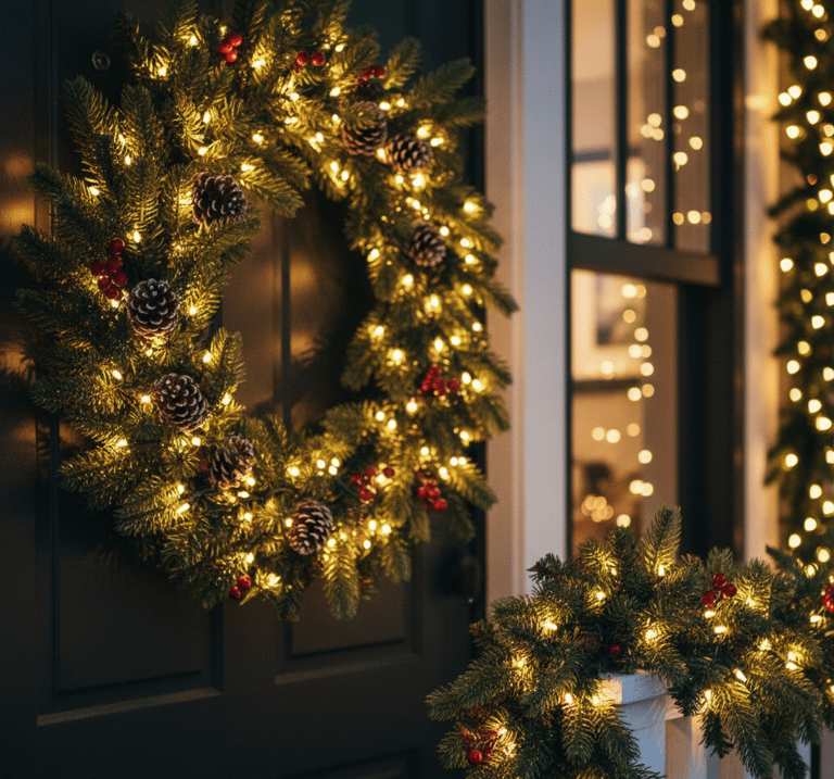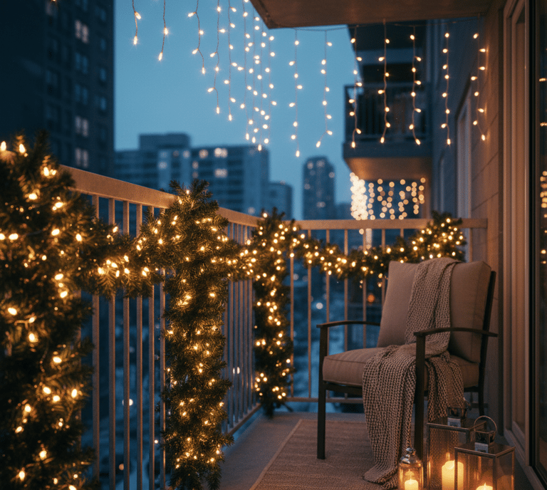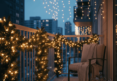Even the smallest apartment balcony can become a holiday haven. Wrap railings in pre-lit warm white garlands, hang string lights from the overhang, and add a few LED lanterns. This creates a private, sparkling escape that you can enjoy from both inside and out.