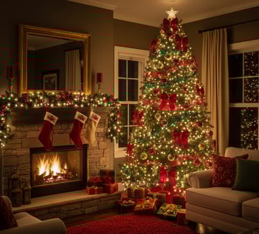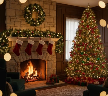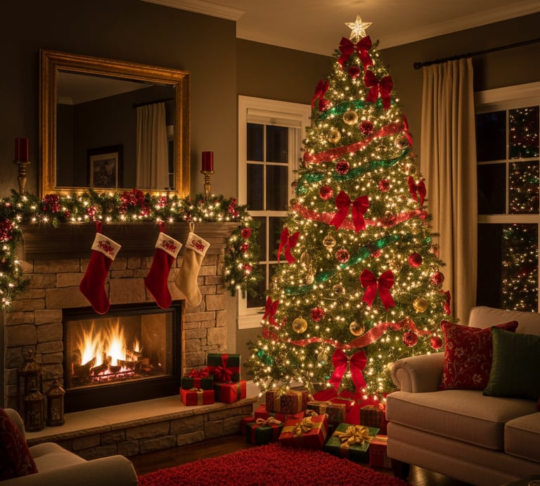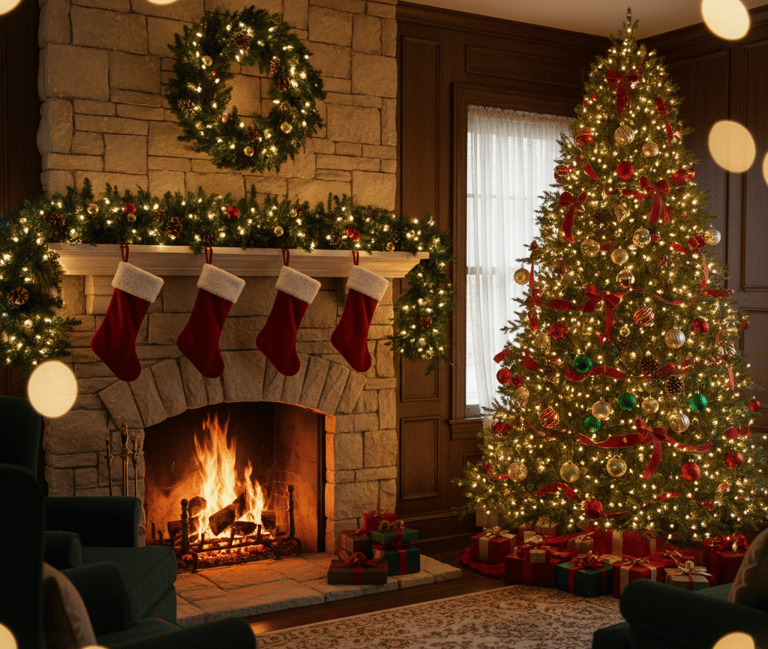 Some looks are timeless for a reason. A lush garland on the mantel, a traditionally decorated tree, and stockings hung by the fire, all illuminated by the soft glow of warm white lights, create that nostalgic, postcard-perfect feeling of holiday charm.