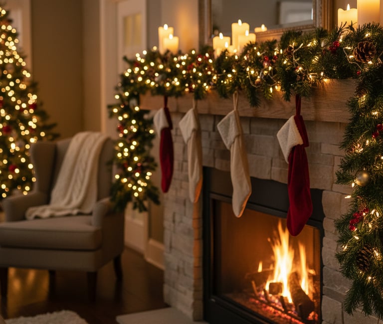The fireplace is already the natural heart of a cozy room. Amplify this by weaving warm white string lights through a lush evergreen garland on the mantel. The combination of the soft twinkle with actual firelight (or candles) creates a layered, magical effect that draws everyone in.